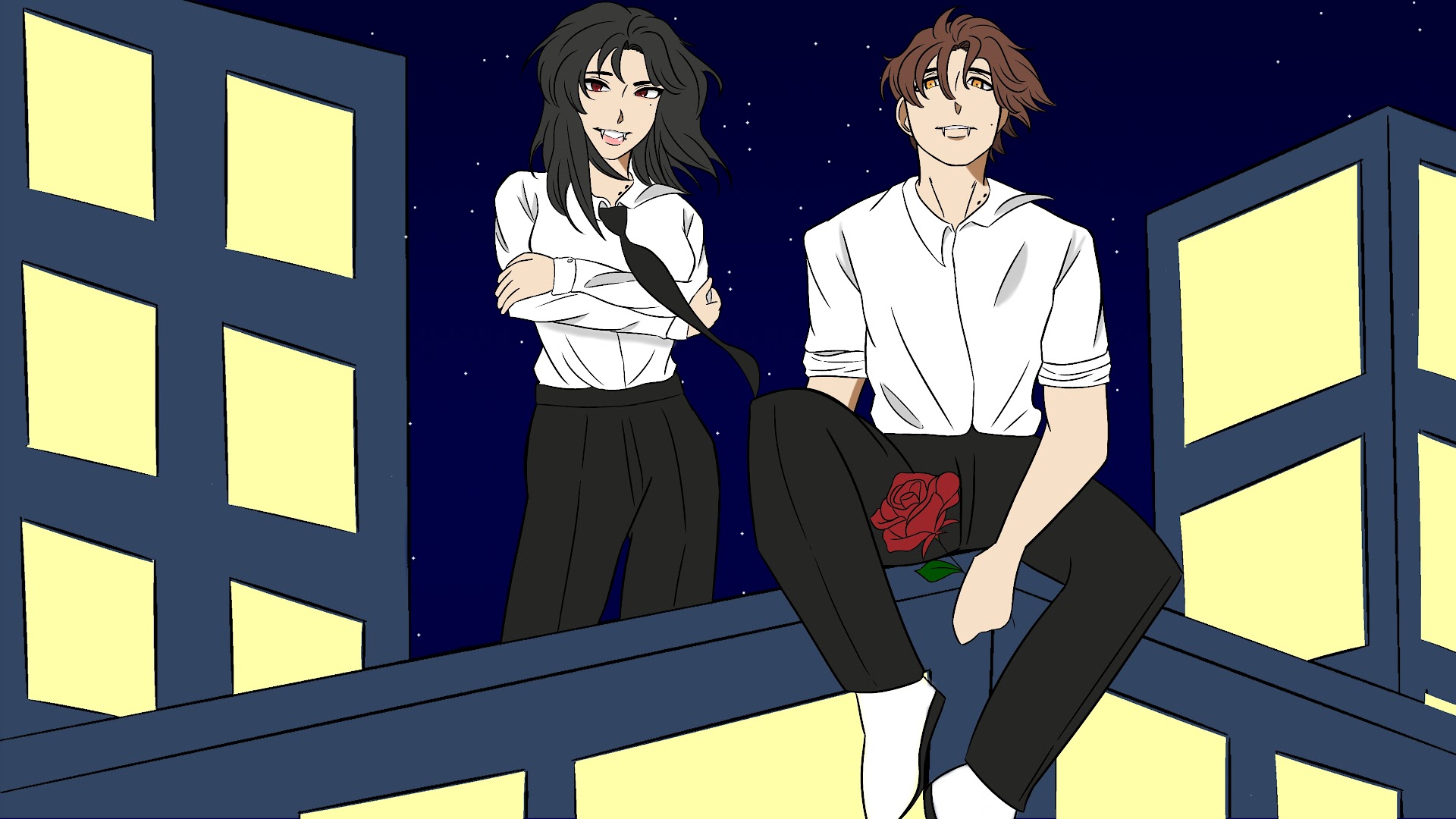 In my version, the narrator (Hiro) is human and encounters a vampire (Momoka) who entices him, hiding her true nature at first. As he falls deeper under her spell, she reveals her dark side, and he becomes unable to resist. Eventually, he succumbs, transforming into a vampire himself, sealing their bittersweet fate together.